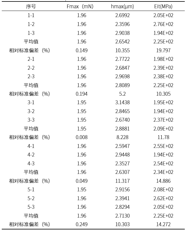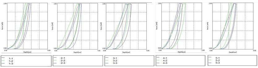 从表3可以看出,在随机选出的5个防水胶膜样品上,每个样品又在靠近中间随机选择了3个位置进行动态硬度测试,测得的Eit弹性模量,每组弹性模量的平均值基本稳定,分布在2.05E+02到2.34E+02之间。从上图显示的5组防水胶样品表面的载荷-深度曲线上,我们也可以看出它们的曲线形态大体相同。