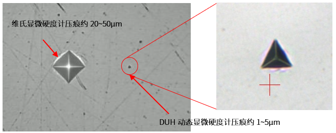 普通的显微维氏硬度计的压痕直径大约20~50μm,而DUH的压痕可以保持在1~5μm,通过500倍目镜可以很清楚地被观察到。