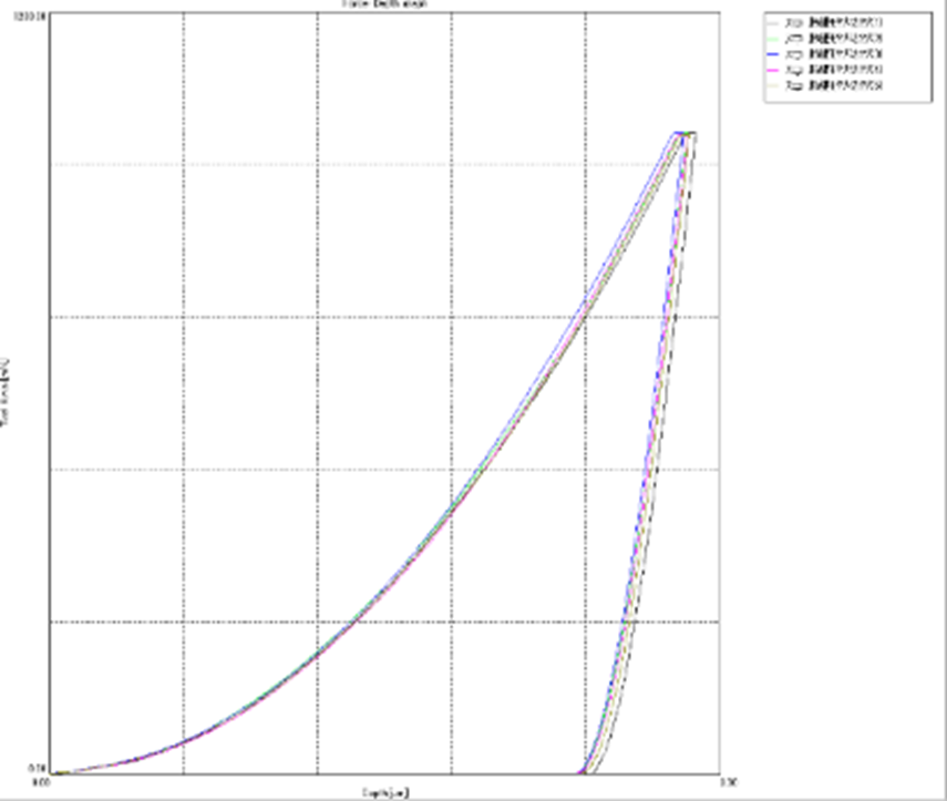 从表3可以看出,在随机选出的5个防水胶膜样品上,每个样品又在靠近中间随机选择了3个位置进行动态硬度测试,测得的Eit弹性模量,每组弹性模量的平均值基本稳定,分布在2.05E+02到2.34E+02之间。从上图显示的5组防水胶样品表面的载荷-深度曲线上,我们也可以看出它们的曲线形态大体相同。