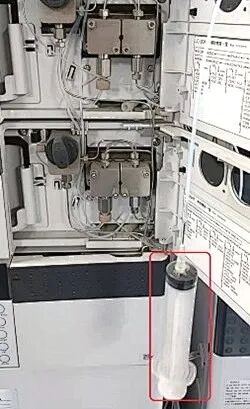 1、手动清洗(注射器式):每次使用完含盐流动相后,用注射器抽取20ml 蒸馏水,注入清洗口,重复2-3次即可。