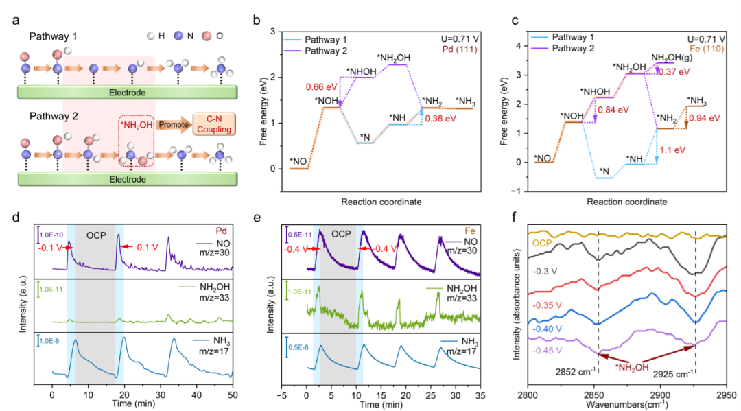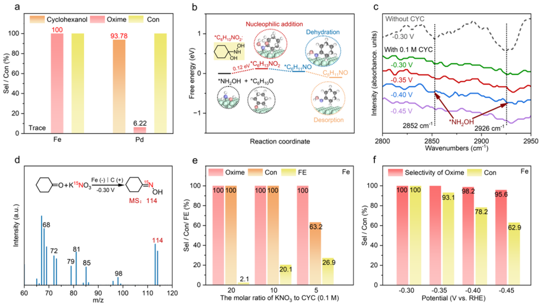 从氮氧化物还原的角度考虑,高效电合成环己酮肟的催化剂需要富集关键中间体*NH2OH。氮氧化物还原的路径较为复杂,根据文献报道我们选用了两种走不同路径(图2a)的模型催化剂铁和钯。通过密度泛函理论计算,微分电化学质谱,原位同步辐射红外联用证明了铁表面更容易富集*NH2OH,可能是电合成环己酮肟的理想电催化剂。