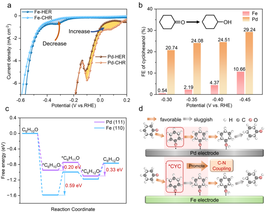 另一种关键中间体吸附态环己酮(*CYC)的积累也至关重要。要促进*CYC的积累,就必须要求电催化剂对环己酮具有较好的吸附能力和较差的加氢能力。通过线性扫描伏安法和GCMS检测在钯和铁表面环己酮的产物分布,证明钯比铁具有好的有机物加氢性能,抑制了*CYC在电极表面的积累。DFT计算的结果也进一步证明了,铁和钯都有较好的吸附环己酮的能力(图3c),但是从能量的变化看,环己酮更难在铁表面加氢,更容易在铁表面积累*CYC。因此,铁表面更容易富集*CYC从而促进了C-N偶联反应(图3d)。