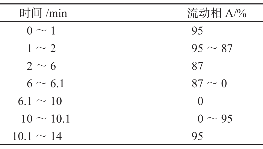 流动相A为0.1%甲酸的水溶液,流动相B为0.1% 甲酸的甲醇溶液,流速为0.8 mL/min;柱温为40℃;进样器温度为10℃;进样量为5 μL,梯度洗脱条件如下表。