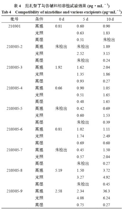 从表4结果可见210305-3、210305-4、210305-5、210305- 6、210305-7批次在高温、光照、高湿的条件下经0、5、10 d检测到的NDMA含量与210301批次(原料)相比无明显变化,表明低取代羟丙基纤维素、羧甲基淀粉钠、硬脂酸镁、交联聚维酮与胃溶型薄膜包衣预混剂对尼扎替丁中 NDMA的产生无促进作用;高温和光照条件下210305-2批次检测到的NDMA含量明显低于210305-8、210305-9 批次。