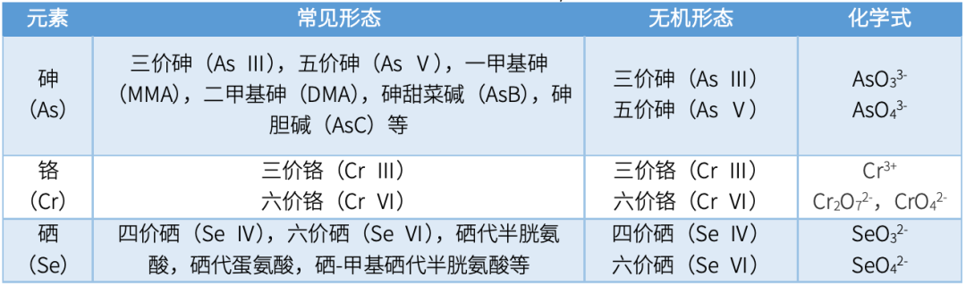 自然环境中砷(As)、铬(Cr)、硒(Se)存在多种化学形态,在不同环境条件下,氧化还原行为存在差异,不同形态对环境和健康影响不同。传统的元素总量分析不能提供足够的信息去了解元素的存在形态,而不同元素形态存在物理、化学、生物活性差异,并与其毒性、生物可利用性、迁移性密切相关。