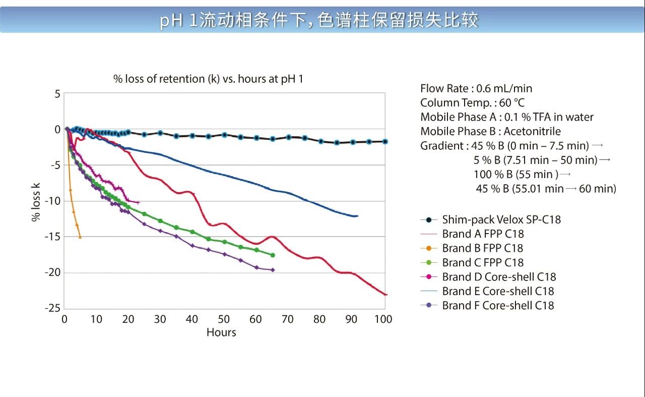 从上图可以看出,在长时间采用pH 1流动相条件下,SP-C18相比其他品牌色谱柱对化合物的保留损失更小,表现出更强的稳定性和耐受性。