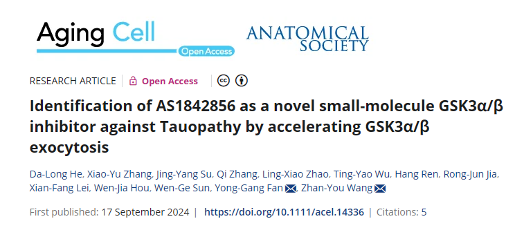 近期,教育部医学细胞生物学重点实验室(中国医科大学健康科学研究所)联合中国科学院大连化学物理研究所分离分析化学重点实验室等单位在Aging cell发表了题为Identification of AS1842856 as a novel small-molecule GSK3α/β inhibitor against Tauopathy by accelerating GSK3α/β exocytosis的研究论文。