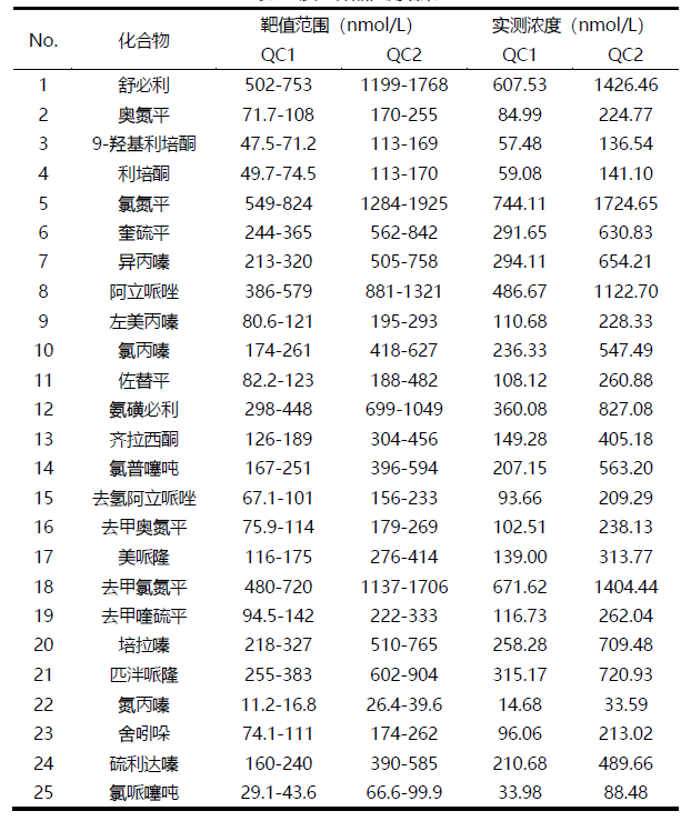 按前处理方法和分析条件对低、高两个浓度的质控品进行分析,质控品的准确度结果如下表。低、高两个浓度水平的质控测定值均在靶值范围之内,满足要求。