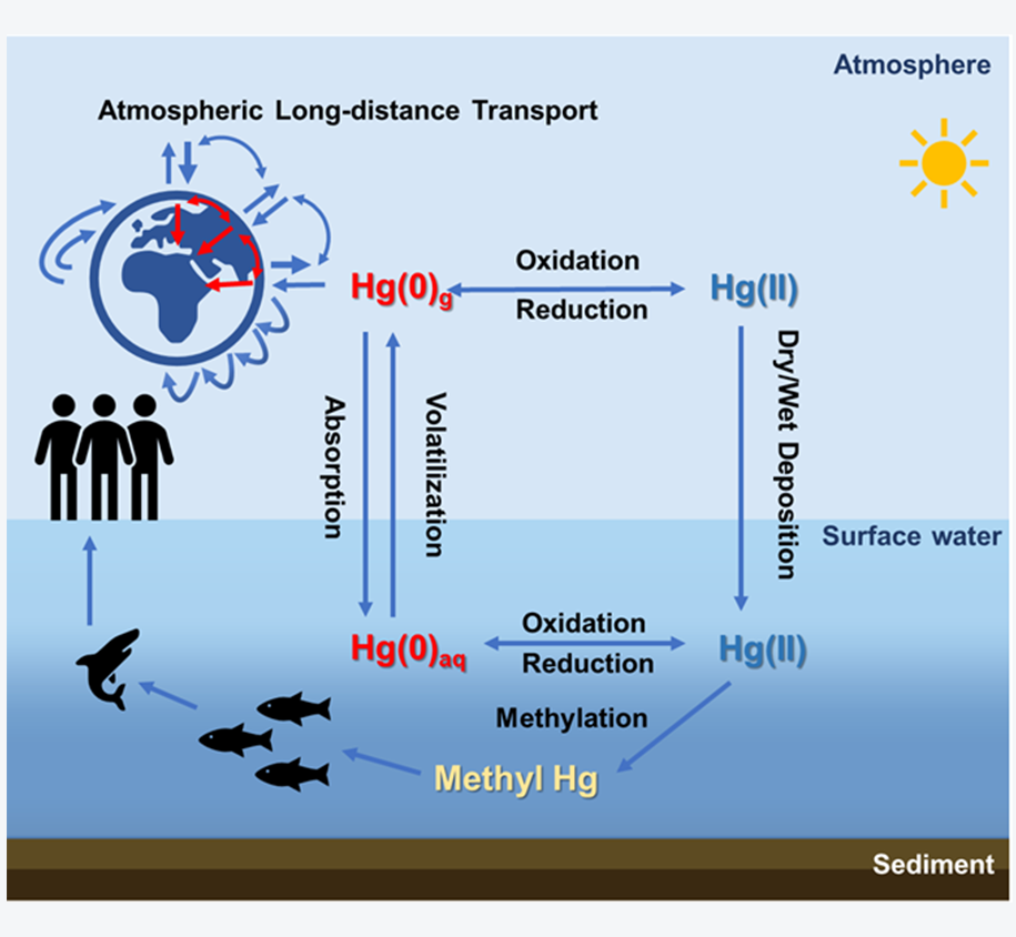 汞(Hg)是一种持久、高毒性的全球污染物。其关键无机形态—元素汞(Hg(0))化学性质稳定,大气寿命长达0.5–1.7年,可随大气环流进行远距离传输。大气中的Hg(0)可被卤素自由基、羟基自由基及臭氧等氧化为Hg(II),并通过干湿沉降进入水体;在水体中,Hg(II) 可被微生物甲基化生成高毒性的甲基汞,也可在光照或微生物作用下还原为挥发性 Hg(0),重新释放到大气中(图 1)。因此,汞在大气与水体之间的形态转化及其跨界面的沉降与再排放过程,共同驱动其全球生物地球化学循环,决定了汞的迁移路径与生态风险。