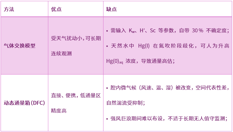 尽管 DFC、气体交换模型和微气象法均被广泛用于水-气界面汞交换研究,但各自存在固有不确定度。同一水域的对比结果如表1所示。现场方法应根据水体类型与湍流状况及研究目标(环境过程调查、机理探索、区域通量测定)做出调整。