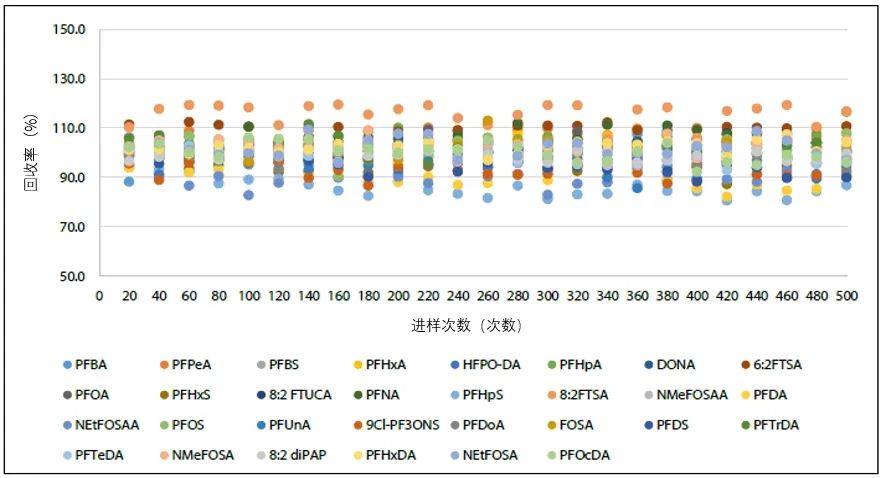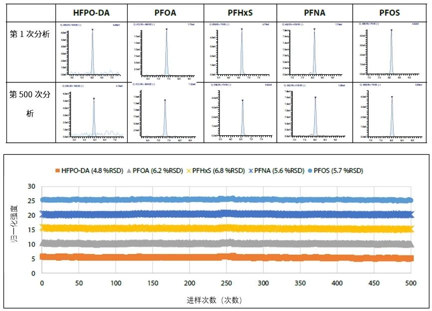 土壤加标样品中五种主要化合物(HFPO-DA、PFOA、PFHxS、PFNA和PFOS),在500次分析的开端和结尾均获得了良好的峰形,且土壤基质样品中PFAS的峰面积重复性良好,RSD<6.8%。