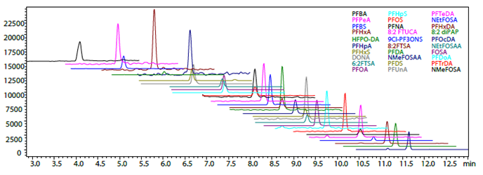 全氟羧酸、全氟磺酸、全氟磷酸酯、全氟磺酰胺、氟调聚体羧酸、氟调聚体磺酸等共30种PFAS目标物,在0.01 µg/L至10 µg/L的定量范围内,几乎所有化合物的相关系数(R)均大于0.996,准确度介于70%至130%之间。重复性良好,所有浓度的%RSD均低于20。