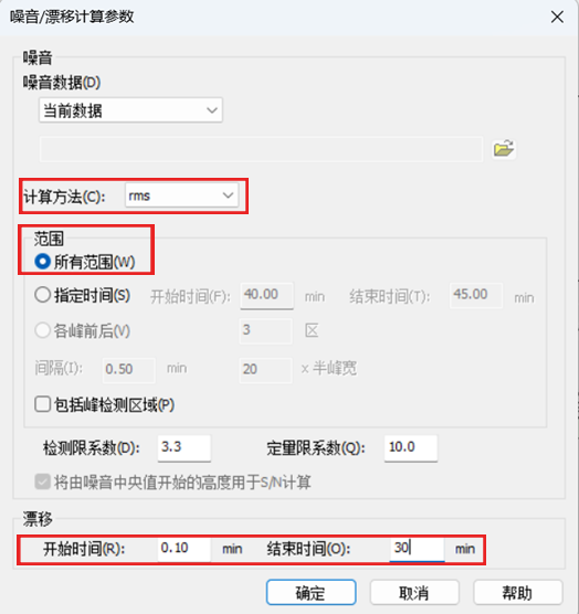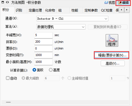 在“方法视图”→“积分参数”界面,点击“编辑”→“噪音/漂移计算(N)…”