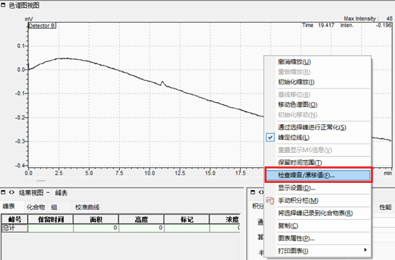 4、 在“方法视图”→“积分参数”界面,点击“视图”即可退出编辑模式,在色谱图界面鼠标右键选择“检查噪音/漂移值(F)…”,即可查看当前数据的噪音和漂移。如下图所示: