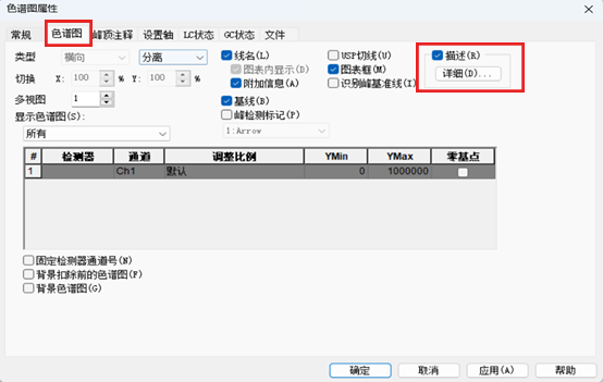 ① 在报告模板中双击色谱图,在色谱图属性中,勾选“描述”,点击“详细”。