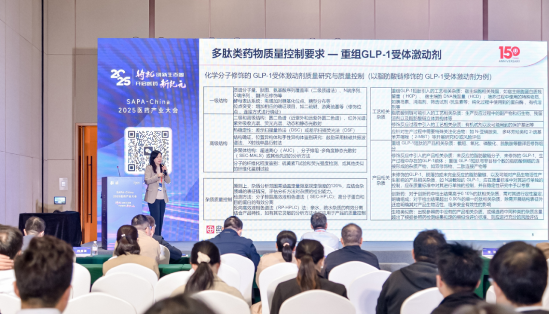 在大会报告“多肽药物CMC挑战”主题中,岛津企业管理(中国)有限公司分析计测事业部营业统括一部市场业务推进部资深专家韩美英博士,发表了题为《GLP-1多肽类药物质量控制一体化解决方案》的专题报告。韩博士系统解读了以GLP-1为代表的多肽类药物在质量控制方面的相关指导原则,并详细介绍了基于岛津分析仪器平台的多肽类药物从研发到生产的整体分析方案。岛津带来的创新解决方案,为应对多肽药物复杂的CMC挑战提供了精准、高效的技术路径,吸引了在场众多专家与业界同仁的浓厚兴趣。