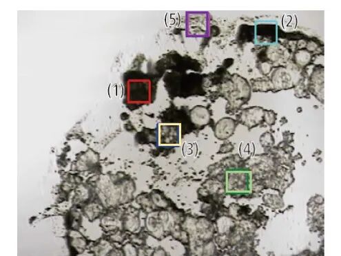使用岛津红外显微系统对异物进行分析,由以上谱图可知,除了淀粉和亚麻油成分之后,还有外来含氟化合物的异物,推测有可能是炊具脱落的碎屑。
