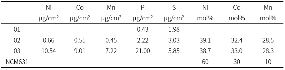 EDX-7200还可以通过薄膜基本参数法对过渡金属溶出进行量化,得到极片表面各元素的附着量以及Ni、Co和Mn这三种过渡金属的摩尔比(表1),约为4:3:3,这与所用正极材料NCM631的摩尔比(6:3:1)之间有明显差异,证实Mn的溶出比例较Ni和Co高。据文献报道,Mn的溶出机理主要为Mn3+歧化反应,生成物Mn2+极易溶出,这一结果与文献相符。在电池研发中,抑制锰溶出正是开发长寿命、高安全性NCM锂电池,特别是高锰或中镍体系电池的关键挑战。