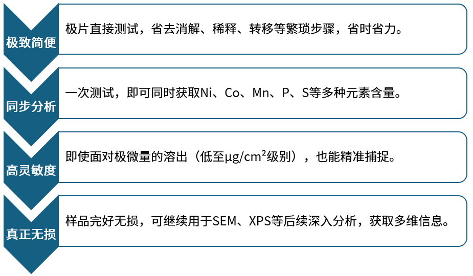 为了锁定这个“元凶”,传统方法的分析过程较为繁琐。研究人员需要将电极片用强酸完全消解过滤,再使用电感耦合等离子体光谱仪/质谱仪(ICP-OES/ICP-MS)进行测定。整个过程流程繁琐、耗时长,且对样品是彻底的破坏,难以满足研发过程中快速、无损的筛查需求。使用X射线光电子能谱仪(XPS)能够进行无损测试,但该类仪器价格高昂测试成本较高。
