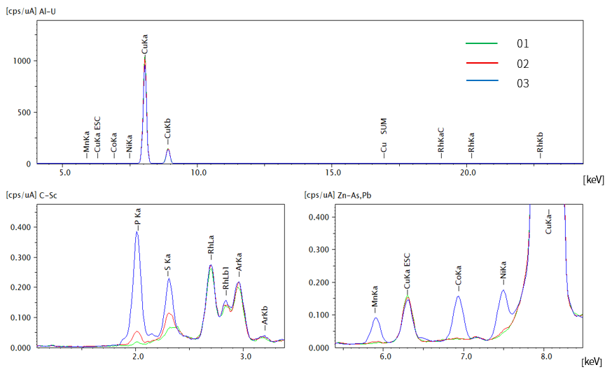 使用EDX-7200对三种极片进行快速分析,通过对谱图的重叠,可以看到三个样品中均检测到石墨层下铜箔集流体的谱峰CuKα,01中检测到微量P和S,但未检出Ni、Co和Mn这些过渡金属元素(绿色谱图)。02中, P、S谱峰增强,也检测到Ni、Co和Mn微弱的谱峰(红色谱图),在03中P、S和过渡金属元素谱峰则明显增强(蓝色谱图)。P和S元素可能来源于电解液分解,Ni、Co和Mn过渡金属来源于正极材料结构变化和电解液的化学腐蚀。高温下进行充放电循环加速了这些进程,因此03中检测到的过渡金属强度显著高于室温下得到的02样品。