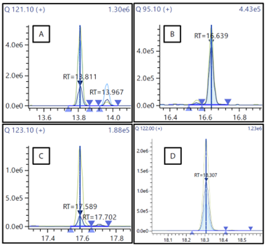 (A)芳樟醇、(B)柠醛、(C)香叶醇和(D)2-苯乙醇的质量色谱图