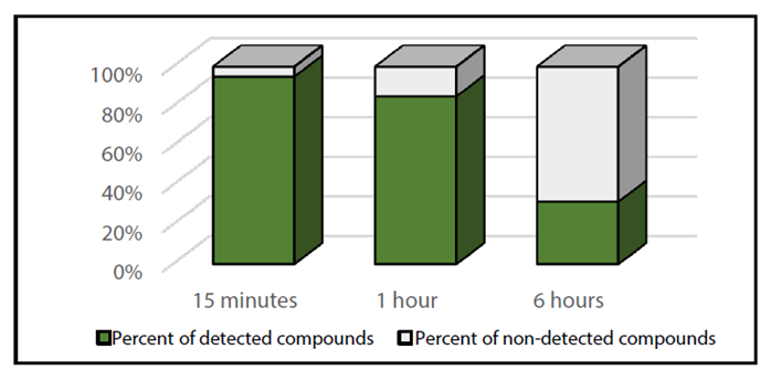 ● 在皮肤涂抹香水15分钟后,香水中受监测的60种香气化合物有58种被检测到,且它们的浓度值均处于最高(与等待1小时和6小时相比),表明香水在涂抹后立即释放出强烈的气味,这与挥发性化合物的预期行为相符。