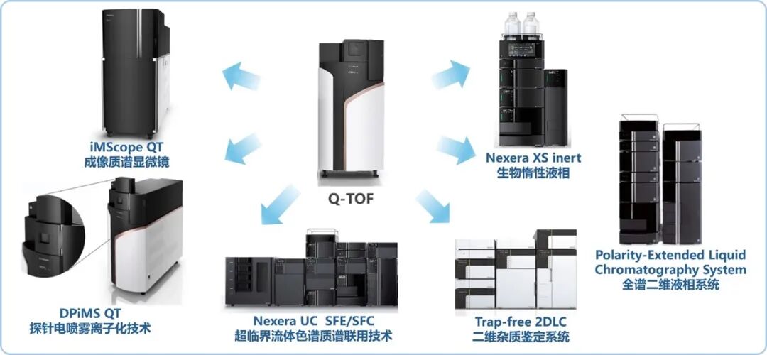 在医药领域,Q-TOF质谱能够灵活应对天然产物、药代动力、杂质鉴定及代谢组学等需求。比如针对复杂基质多目标物,✅ 4in1分析系统即全谱二维液相与LCMS-9050联用系统,通过特色串联HILIC与RPLC技术,一次进样可实现从低极性到高极性目标物的分离,并且可节省3/4的样品量和总分析时间;✅生物惰性液相系统解决生物药吸附残留问题;✅二维杂质鉴定系统助力药物杂质分离;✅超临界流体色谱操作便捷、自动化程度高、前处理配置丰富;✅探针电喷雾实现在线原位分析;✅成像质谱显微镜能提供目标组分在空间分布的可视化图像,这些技术共同推动了医药分析的高效与精准。