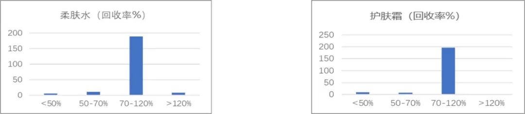 ● 以柔肤水和护肤霜为例,回收率以70~120%为主(图7)。