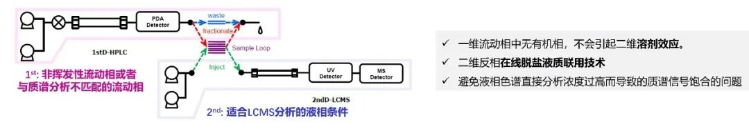 随着法规标准提升,确保原料药纯净度以保障药品安全性和有效性愈发关键,但传统杂质检测方法已难以满足监管要求。2D-LCMS-QTOF技术为制药行业提供一种高效、精确的杂质检测解决方案。采用岛津二维液相与四极杆-飞行时间质谱联用仪(Trap-free 2DLC+LCMS-9050),可有效解决常规一维分析中使用非挥发缓冲盐无法进质谱的问题,同时一维分析方法不用调整,可保证保留时间分离不受影响。