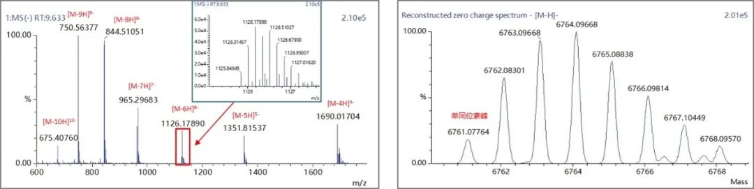 图8. 左:寡核苷酸一级质谱图;右:寡核苷酸去卷积谱图