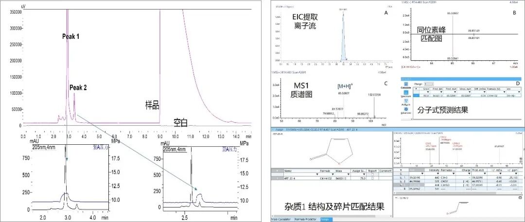 图4. 左:左卡尼汀一维UV色谱图;右:杂质1结构鉴定结果示例