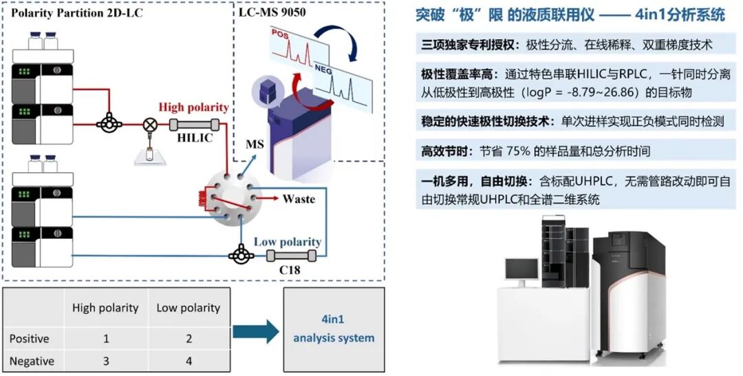 代谢物极性的广泛分布给全面分析带来了巨大挑战。传统的单一分析方法往往难以覆盖所有极性范围的代谢物,导致信息缺失和分析不准确。为解决这一难题,岛津推出了其创新的全谱二维-高分辨液质联用仪(4in1分析系统,图10):