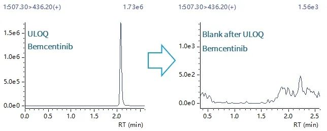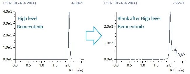 图2. 高浓度Bemcentinib进样后系统残留情况对比