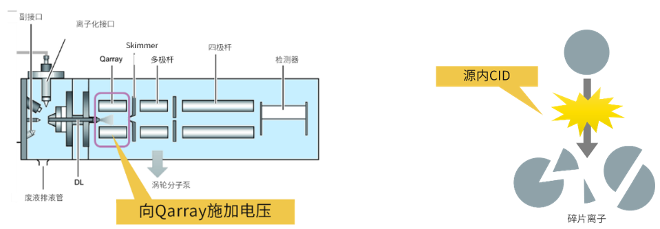 传统单杆质谱的短板在于无法获取碎片信息,而岛津LCMS-2050在离子源与质量分析器间创新设计Qarray透镜区(图1),实现"一级质谱硬件"输出"二级质谱数据",大幅降低结构解析门槛。其核心技术在于: