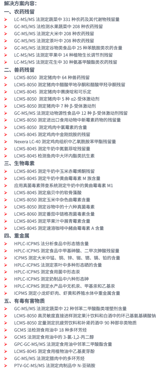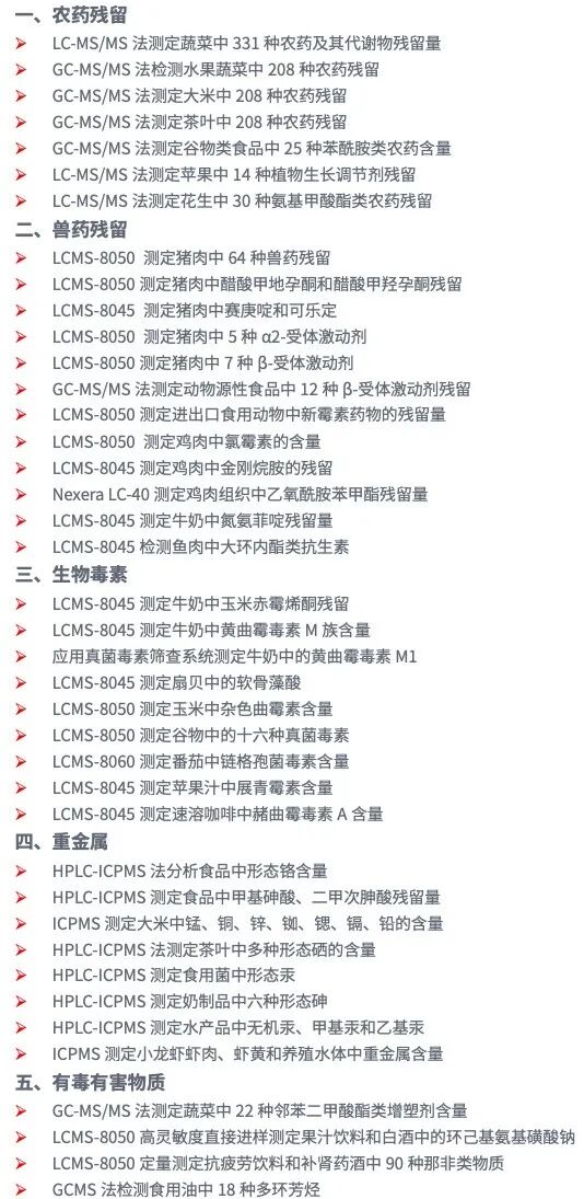 岛津凭借先进的技术,不断提高先进应用技术,满足市场的各类新需求,为实验室检测提供强大的技术支柱。本次汇编的解决方案包含农药残留、兽药残留、生物毒素、重金属和有毒有害物质5大板块,共计收录45篇应用报告,先来预览一下吧。