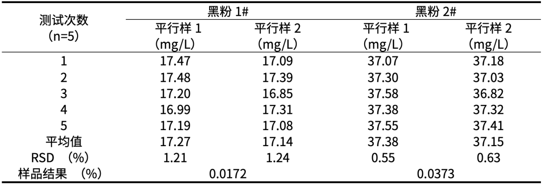 对两款再生黑粉样品的检测结果显示,其水浸出性TOC平行样测定稳定性良好,验证了方法的适用性和可靠性。