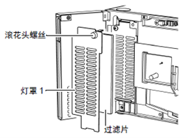拧松灯罩1的滚花头螺丝(白色),然后取下灯罩1和过滤片。滚花头螺丝(白色)从灯罩1取不下。